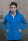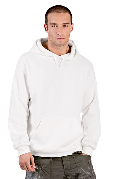 280 grams; 80% ringgesponnen gekamd katoen, 20% polyester, dubbele capuchon met rijgkoord, ingezette mouwen, ribgebreide manchetten en boord met elastan, opgezette kangoeroe zak, modieus model, rondgebreid.