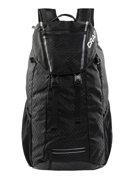 Duurzame tas met verschillende praktische functies zoals een elastisch net voor een helm, een computervak en een regenhoes. Afmeting: 30x19x55cm.