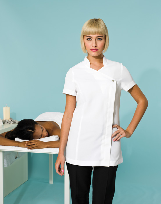 Schoonheid en Spa tuniek met functietoets voorsluiting.
