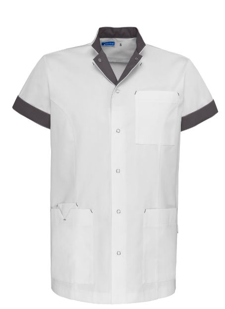 Unisex jack met opstaande boord, diverse zakken o.a. met telefoonzak, mouwomslag en zijsplitjes. Uitgevoerd in wit met kleurafzettingen aan binnenzijde van boord, mouwen en zijsplitjes