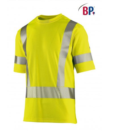 Ronde hals, 1/2 mouw met doorlopende, reflecterende band (heat transfer), 1 doorlopende reflecterende band (heat transfer) boven de zoom aangebracht, 2 doorlopende verticale reflecterende band (heat transfer) op voor- en rugpand opgedrukt, reflecterende strepen stretch materiaal gesegmenteerd.
