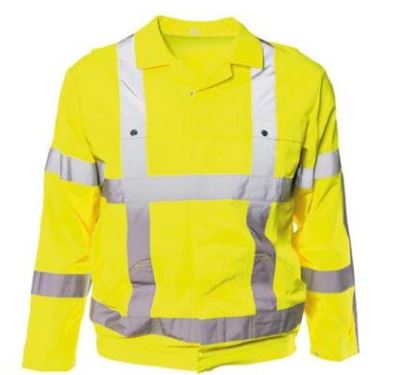 Kwaliteit: 55% katoen/45% polyester, 280 gr/m². Verdekte drukknoopsluiting. Twee borstzakken met drukknopen. Elastiek in rug. Kleur: fluo geel.