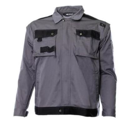 Kwaliteit: 65% polyester/35% katoen, 270 gr/m². Verdekte ritssluiting met drukknoopsluiting. Manchetten met drukknoopsluiting. Twee borstzakken met klep, d-ring en gereedschapslussen. Versterkte schouderstukken. Twee verticale steekzakken. Afritsbare mouwen. Pennenzakje op mouw. Kleur: grijs/zwart.