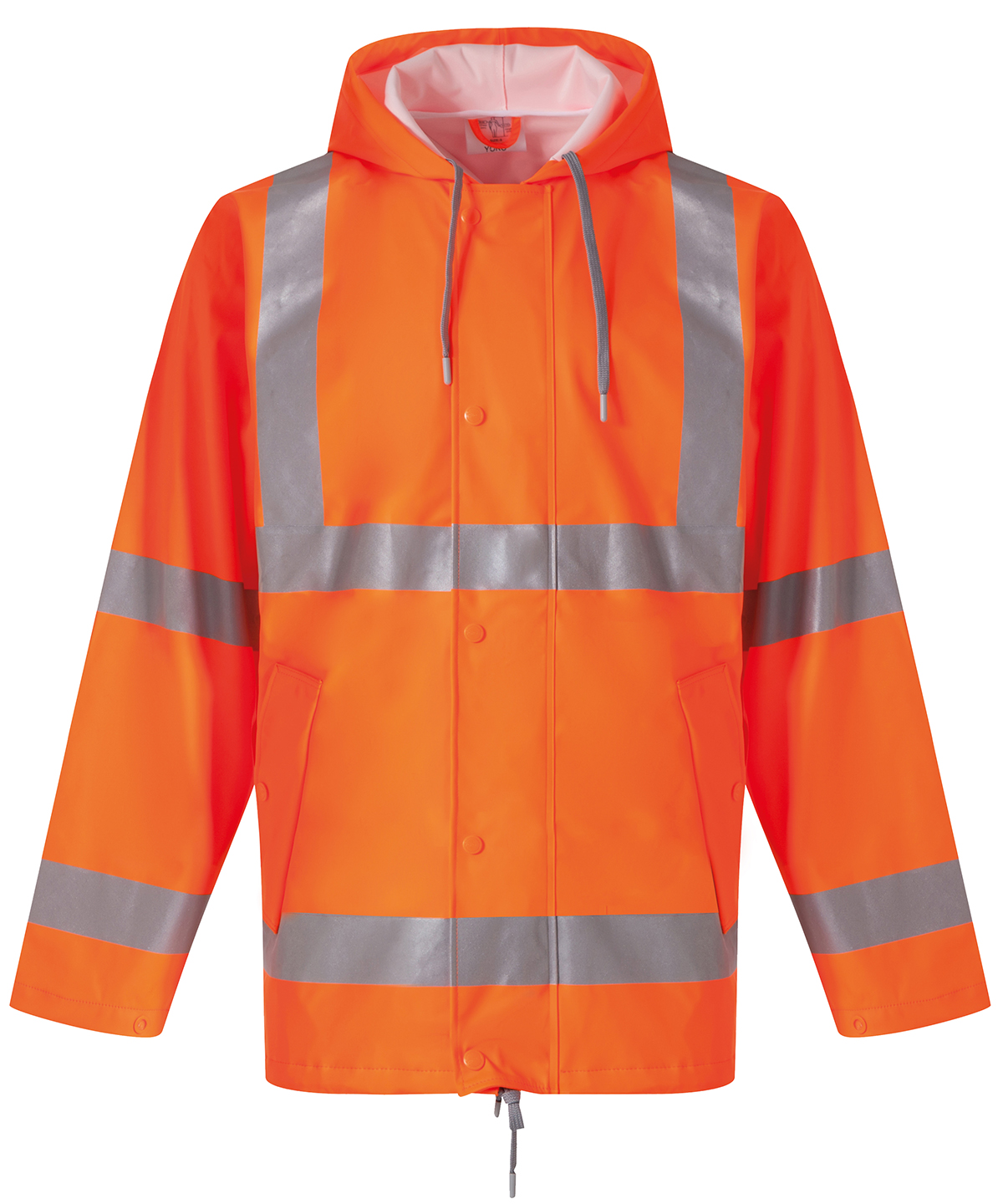 YOKO’s soft flex breathable U-dry jacket is crafted in 2-layered technical fabric with cotton backing for both waterproof and breathability. Offered in a regular fit to accommodate mid-layers and ideally to be worn all-year around. Conform to EN ISO 20471 Class 3 and EN343 Class 3.3. Orange also conforms to RIS-3279-TOM. Made of soft- touch breathable PU transfer coated outer fabric with cotton backing. Two 5cm width heat sealed reflective tapes around the body and arms, one over each shoulder. Drop hood, rear ventilation, elasticated cuffs; two lower pockets; drawcord on the hem; stitched and tape welded seams throughout.