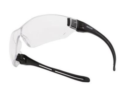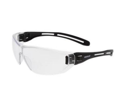Veiligheidsbril met heldere lens en zwart montuur. Polycarbonaat lenzen. Volledig metaalvrije veiligheidsbril. Door de veerkrachtige brillenpootjes wordt de bril automatisch gevormd naar verschillende hoofdmaten voor een optimale veilige pasvorm. Universele neusbrug zorgt voor goede pasvorm. 8 base lens kromming voor optimale wrap-around. Antidamp-coating met antikras eigenschappen. UV400-bescherming. Per stuk verpakt in een mooie polybag met ophangmogelijkheid. Gewicht: 26 gram. Lensmarkering: 2C-1.2 O 1 FT CE. Kleur: heldere lens.