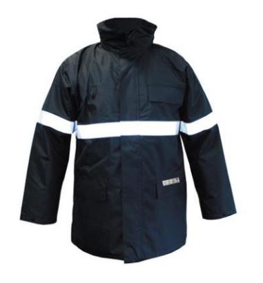 Kwaliteit: 100% polyester weefsel met 100% FR PU-coating, 250 gr/m². Ritssluiting onder beleg met klittenbandsluiting. Rechtopstaande kraag met capuchon in de kraag. Vaste vlamvertragende katoen voering en uitneembare vlamvertragende fleecevoering in lijf en mouwen. Twee opgezette zakken, een Napoleonzak, een borstzak en lusje op rechterborst. Rond ingezette mouwen en mouwvernauwing d.m.v. drukknopen. Elastisch koord in zoom. Naden waterdicht getaped. Kleur: marineblauw.
