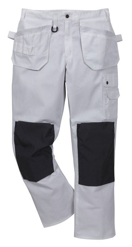2 loshangende zakken met 1 groot vak en 3 kleine vakjes/2 achterzakken/dijbeenzak met klep en zak voor telefoon/duimstokzak,pennenzakje en lus aan de rehterkant/2 hamerlussen/D-ring/polyamide kniezakken voor in hoogte verstelbare kniebeschermers/ contrasterende stiksels.