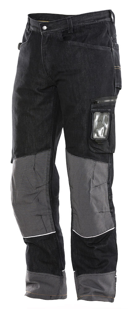 Versterkte achterzakken. Hamerlus en duimstokzak op rechterbeen.