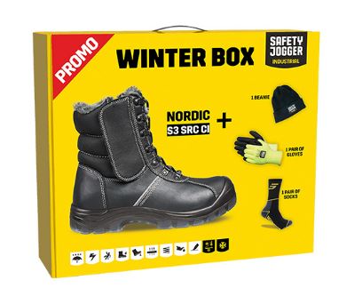 Winterbox inclusief 1 paar Noordse veiligheidsschoenen, 1 paar sokken, 1 paar winterwerkhandschoenen en een warme Safety Jogger muts
